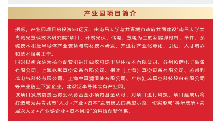 座谈会上,王丰鹏指出,在元宵佳节这一天,举办这样一个非常有意义的签约仪式,以南昌大学共青城光氢储技术研究院加泛半导体装备产业园模式,把南昌大学的科技成果转化为产业化发展,这是把科研成果“写”在大地上,把科技成果运用到实践中的具体实践。在此感谢南昌大学长期以来对共青城市的关心和帮助,同时也欢迎院士和各企业家把产教融合的研究院落户共青城,光氢储技术及泛半导体的技术前景非常广阔。共青城市近几年在大家的关心支持下取得了长足的发展,“十四五”期间,共青城市定下了人口翻番突破40万人、高新区主营业务翻番突破1000亿元、财政收入翻番突破100亿元的三个翻番目标,要实现上述目标,最核心的是要有科技、有项目的支撑,我们希望通过研究院和产业园项目的签约,共青城市能够成为南昌大学产教融合的实验基地。共青城市委市政府将全力以赴做好服务,共同促进各产业、项目在共青城市发展壮大。