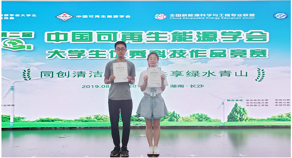 2019年8月17日-19日,第二届中国可再生能源学会大学生优秀科技作品竞赛于长沙理工大学举办,我院推送的 "基于大面积柔性钙钛矿太阳能电池的可折叠式多功能可回收晴雨夜三用伞" 入围决赛,获得大赛二等奖。