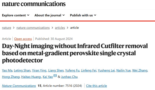 面向昼夜成像领域需求的光电探测器,姚凯教授课题组在Nat. Commun. 上发表论文,通过采用基于Pb−Sn合金单晶且具有垂直带隙梯度结构的钙钛矿光电探测器来解决这些挑战,该探测器在不同偏置下呈现可变光谱响应,并将红外检测范围扩展至接近1100 nm。利用梯度结构在迁移率和内建电场上的优势,该钙钛矿光电探测器展现了177 dB的宽线性动态范围。进一步,开发了一个不需要红外截止滤光片去除的成像模块原型,该原型在红外干扰下表现出优良的色彩保真度。该工作由吉林大学、南昌大学、香港理工大学、复旦大学等多个课题组紧密合作完成,南昌大学姚凯教授为本工作唯一通讯作者。