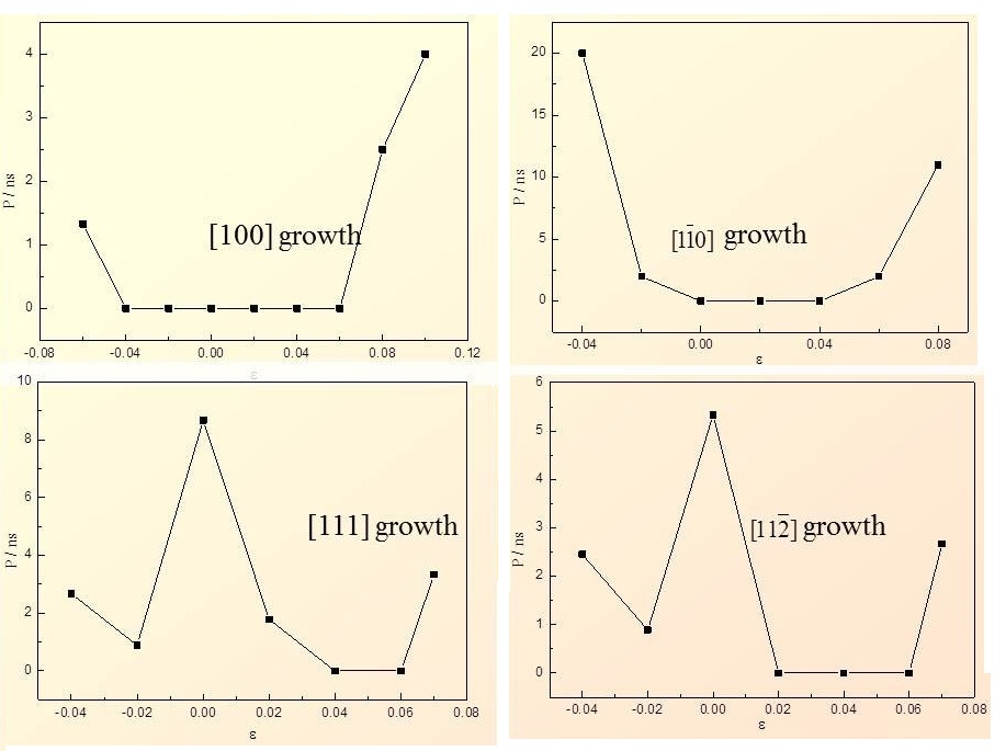 图2 不同内应力条件下四种方向硅晶体生长中位错形核几率