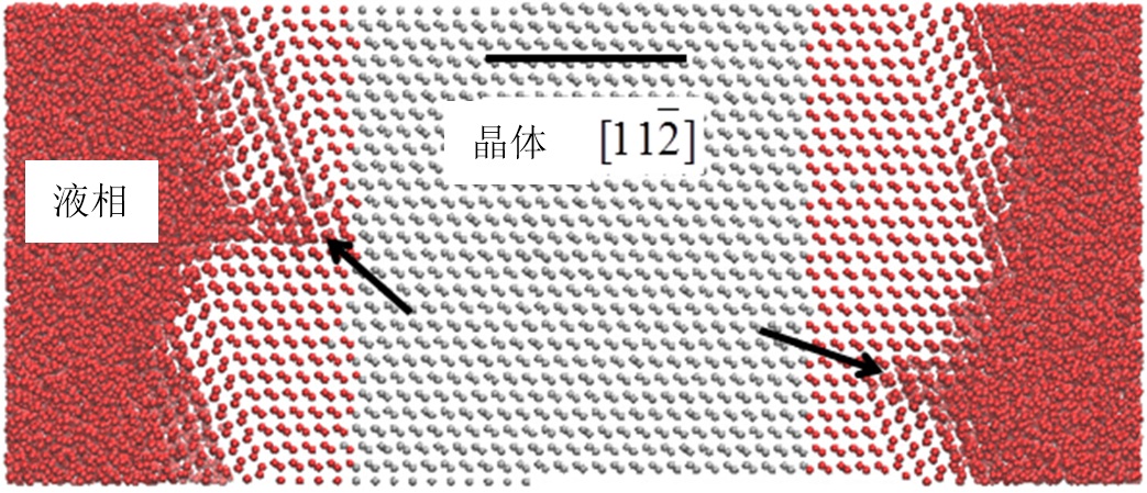 图1 硅晶体<112>生长中一个瞬间的原子结构,显示一种伴随孪晶形成的位错形核情况