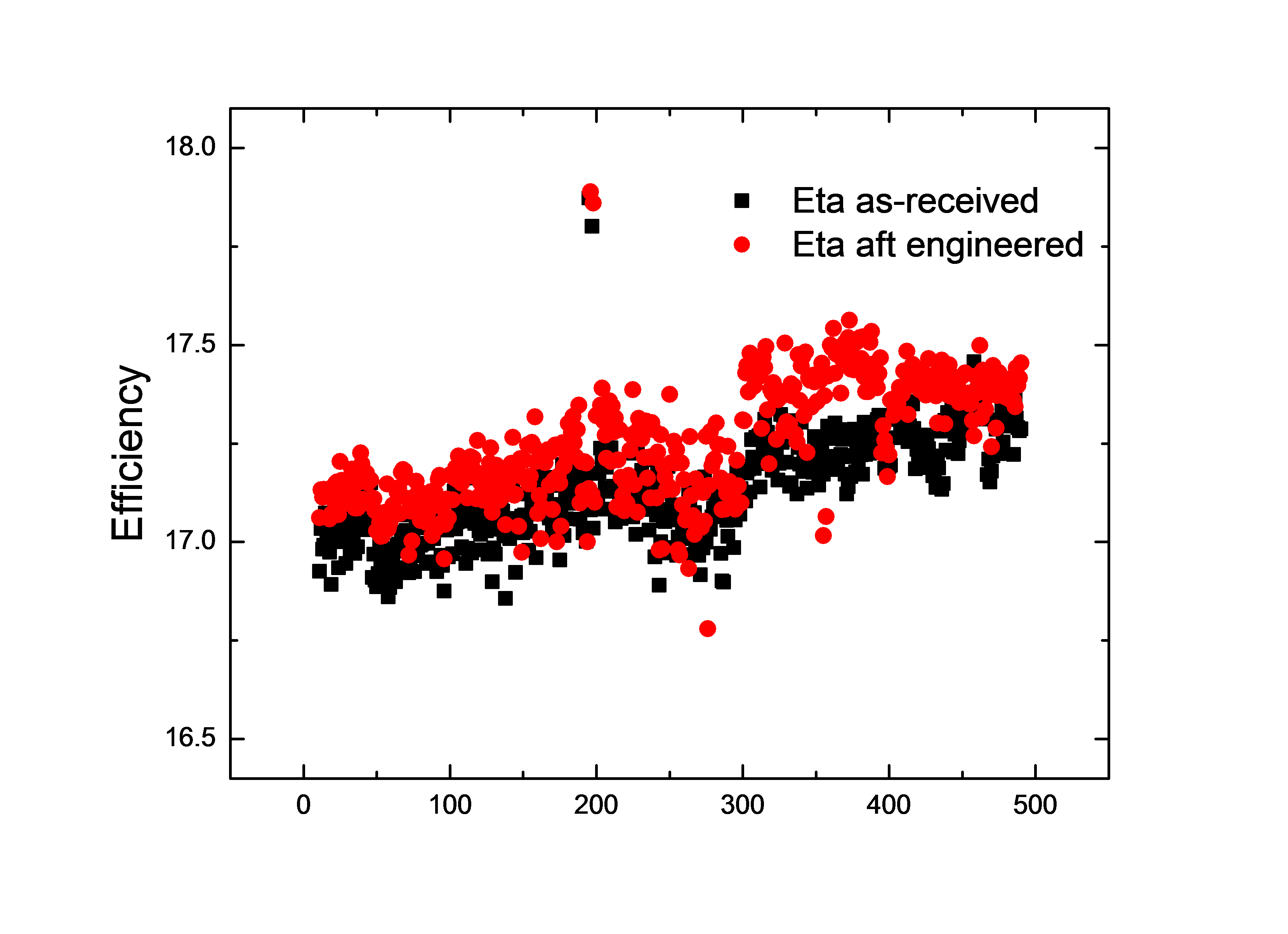 我们从2007年即开始关注和研究相关问题[1-10],并逐渐形成上述概念。图7归纳了我们所提出的晶体硅材料的各种热敏感因素。2014年开始我们与金晟阳光合作开发陶瓷辊道式连续热处理炉,并在本院建成实验线(图8)。2015年我们与太阳电池企业合作实施应用太阳电池成品追加热处理增效技术,取得初步成功,图9示出我们对一批低效电池片追加实施Thermal Engineering取得的增效效果。近期我们又进一步指导金晟阳光设计制造了用于消除硅片太阳电池光致衰退(LID)的连续辐照退火炉。陶瓷辊道式连续炉及其应用技术于2015年4月28日在SNEC PV POWER EXPO国际展会上被评为“光伏技术进展十大亮点”之一。